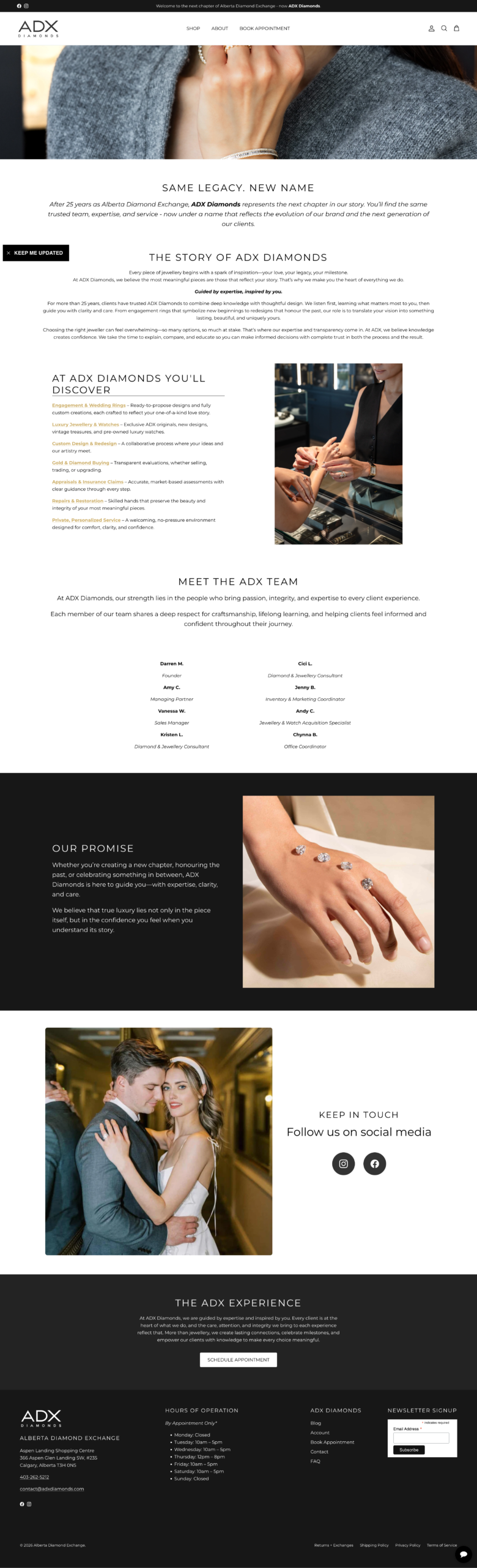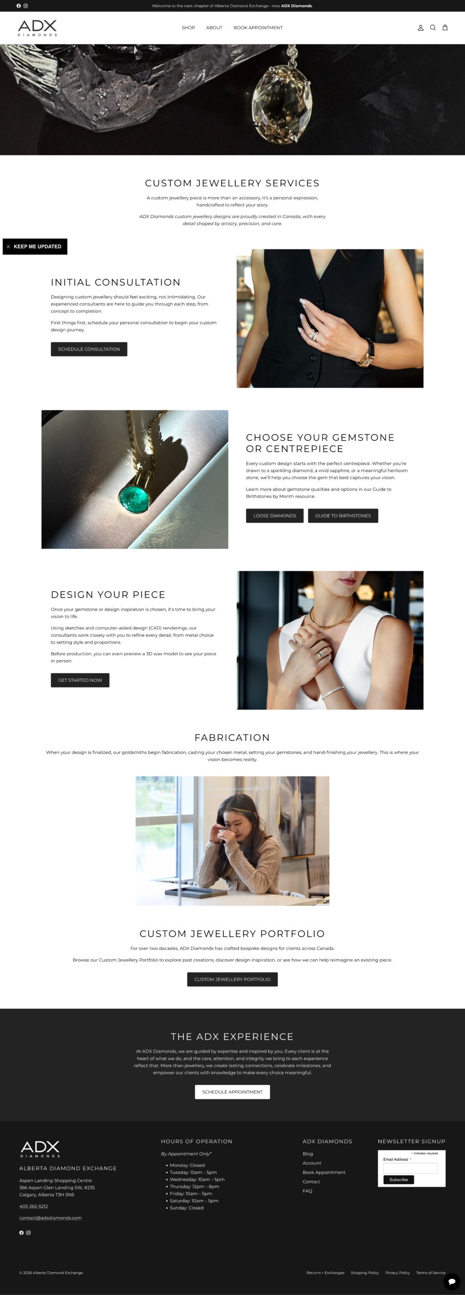 ADX Diamonds is a premium jewellery brand built around elegance and craftsmanship. This project involved custom Shopify development with fully tailored sections and schema to support a luxury shopping experience.